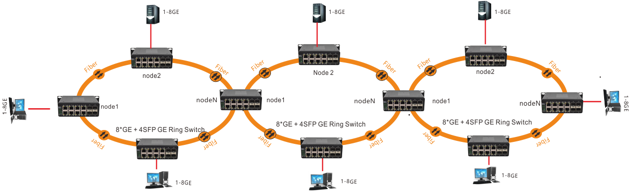 This series of products using industrial redundant ring network design four Gigabit optical ports can be ring you can achieve the function of the tangent ring industrial redundant ring network design is to achieve in harsh environments the stability of data transmission Reliability and real-time. Its working principle is the physical connection into a ring structure the work of the network signal into a chain structure once the transmission cable somewhere node break the device in a very short time automatically switch to the backup line transmission. Redundant ring network structure not only reduces the risk of data transmission but also simplifies the installation of the project reducing the cost of the project.