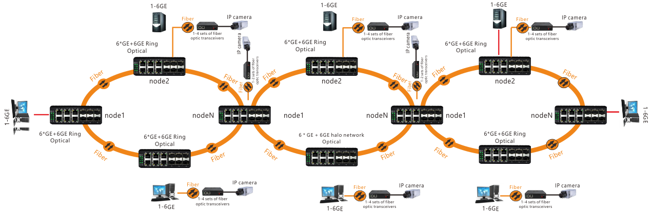 This series of products using industrial redundant ring network design six Gigabit optical ports in the four Gigabit optical ports can be ring you can achieve the function of the tangent ring industrial redundant ring network design is to achieve in harsh environments Data transmission stability reliability and real-time. Its working principle is the physical connection into a ring structure the work of the network signal into a chain structure once the transmission cable somewhere node break the device in a very short time automatically switch to the backup line transmission. Redundant ring network structure not only reduces the risk of data transmission but also simplifies the installation of the project reducing the cost of the project.