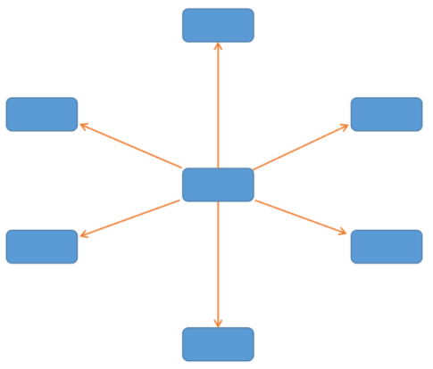 星型拓扑结构中,中央汇聚节点单元以放射状连接到网中的各个结点。网络中的各节点通过点到点的方式连接到一个汇聚节点(多光汇聚型交换机)上,由该汇聚节点向每个目的节点传送信息。星型拓扑结构图如下: