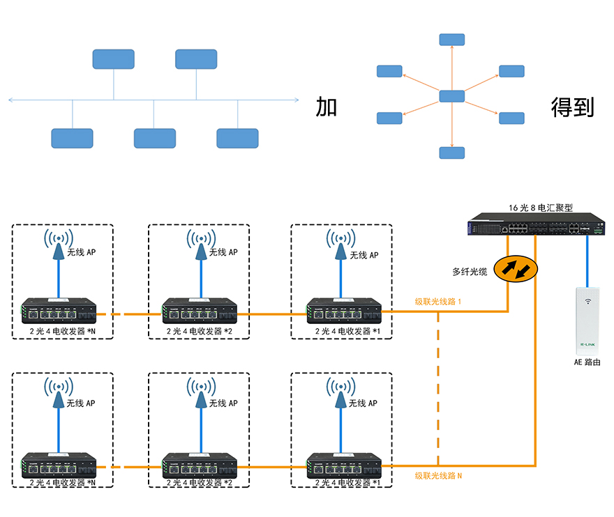 例如上图:是多条总线结构(手拉手级联)连接到一台汇聚交换机,组合成更大的复合型网络。