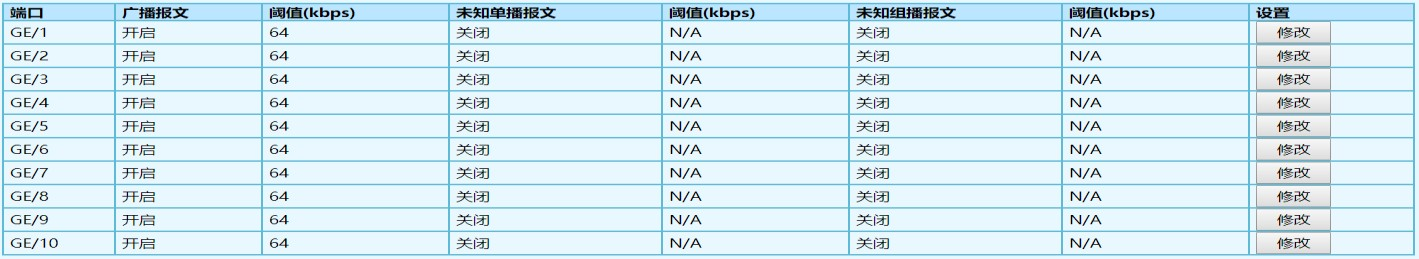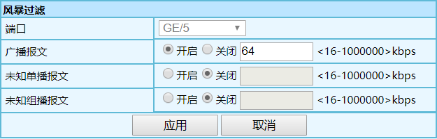选择是否开启对广播报文的速率抑制。可通过单选按钮进行选择。 开启 --如果选择开启,则要输入相应的速率抑制值,<16-1000000>,歩 进为 16,单位为 kbps 关闭 |