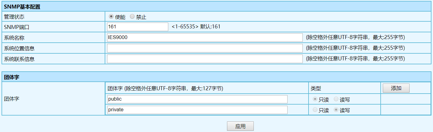 SNMP全局使能状态: 使能:开启SNMP功能。 禁止:关闭SNMP功能。注:默认为开启。 |