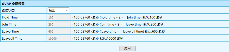 GVRP全局使能开关。 使能:使能GMRP功能; 禁止:关闭GMRP功能。注意:默认关闭。 |