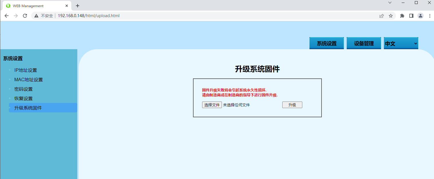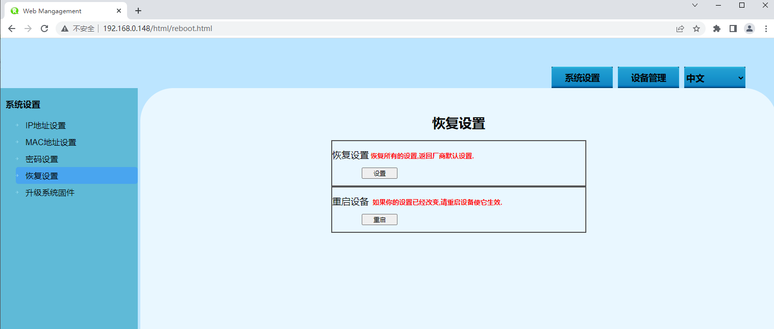 | 恢复出厂设置 | 单击此按钮,设备将失去所有现有配置,恢复为出厂配置。 |