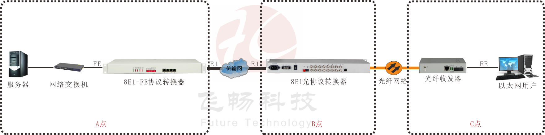 • 飞畅科技-8E1转3路百兆电以太+1路百兆光以太 协议转换器